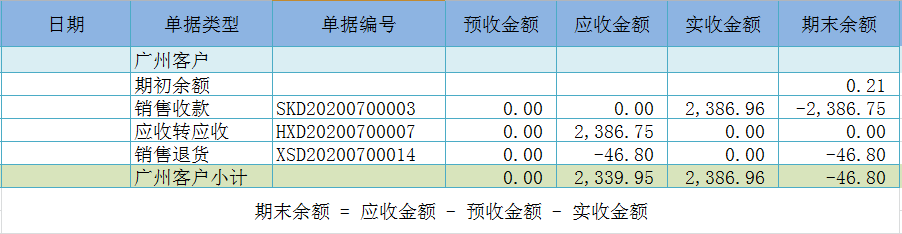 第一行表示标题;第二行表示客户,是一行空行;第三行是期初余额,只显示期末余额的数据,第四至第六行表示的是每种单据的余额情况,并逐步汇总当前行的期末余额数据;最后一行表示的是对客户的合计。