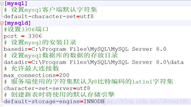 2 如果在mysql的安装路径(C:\Program Files\MySQL\MySQL Server 8.0)中没有配置文件,则自己手动创建一个,文件名为:my.ini,添加内容如下: