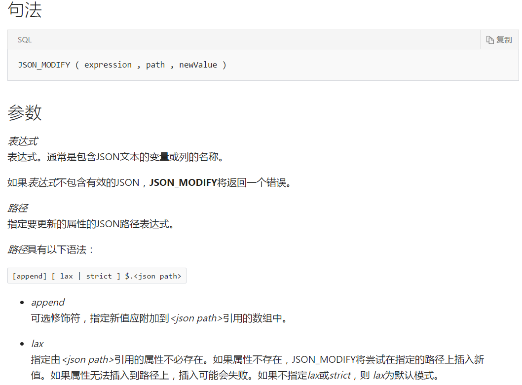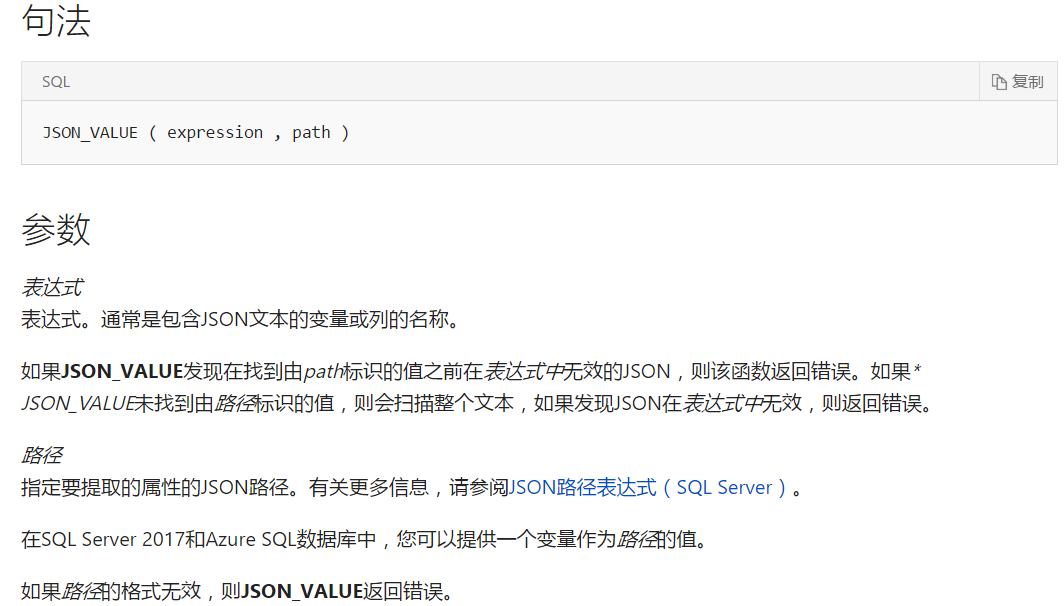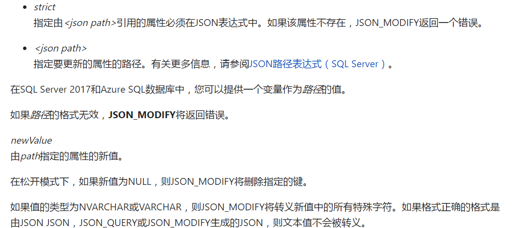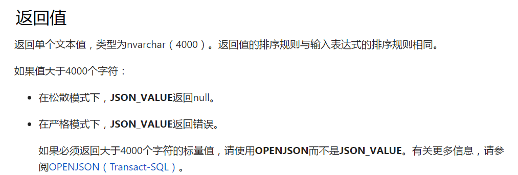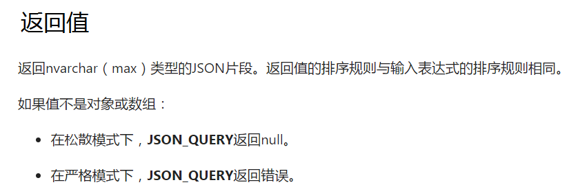 - JSON_VALUE 和 JSON_QUERY 函数转移和获取Varchar格式的数据,因此必须将数据转译成你需要的类型。