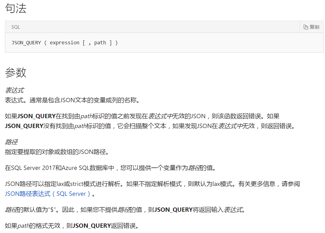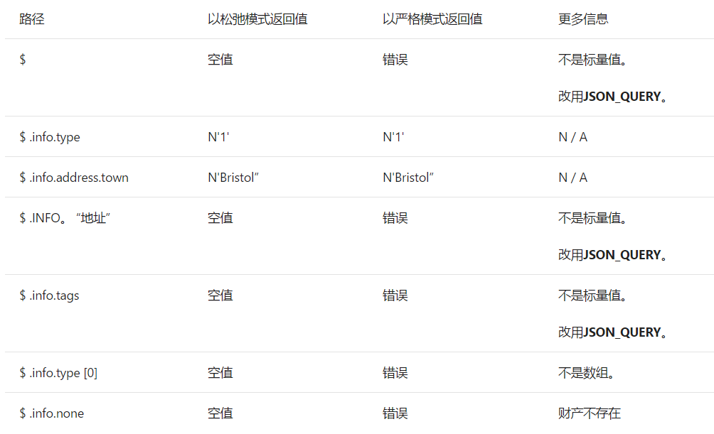 要从JSON字符串而不是对象或数组中提取标量值,请参阅JSON_VALUE(Transact-SQL)。有关JSON_VALUE和JSON_QUERY之间的差异的信息,请参阅比较JSON_VALUE和JSON_QUERY。
