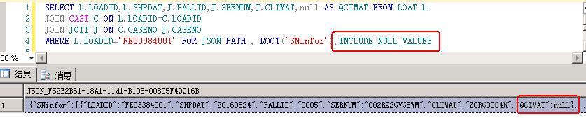 为NULL的数据在输出JSON时,会被忽略,若想要让NULL的字段也显示出来,可以加上选项INCLUDE_NULL_VALUES,该选项也适用于AUTO。