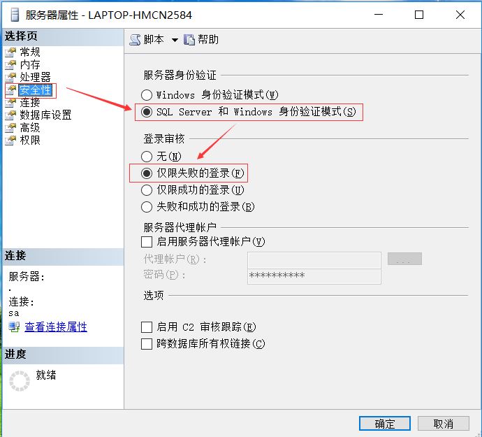 安全性=》SQL Server 和 Windows 身份验证模式 =>仅限失败的登陆