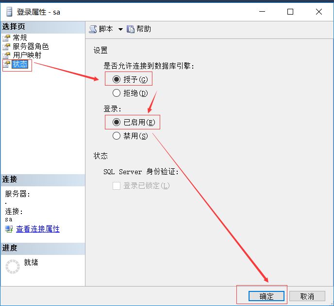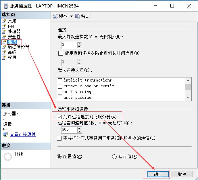 连接 =>勾选“允许远程连接到此服务器” =>确定