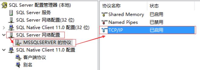 Sql Server网络配置 =>MSSQLSERVER的协议 =>设置TCP/IP为启用