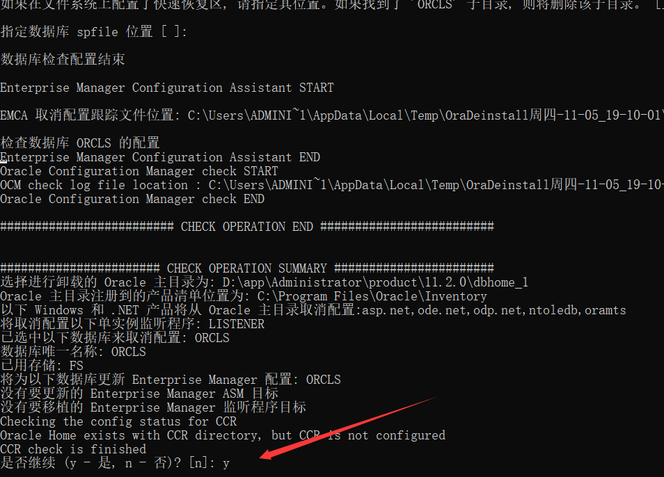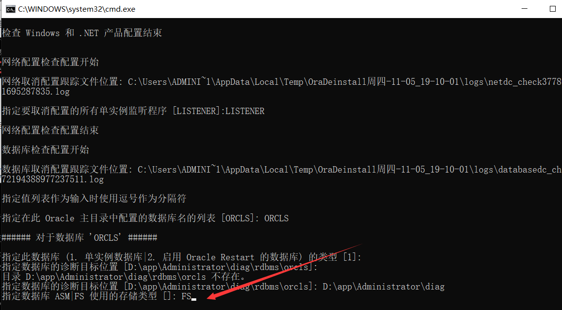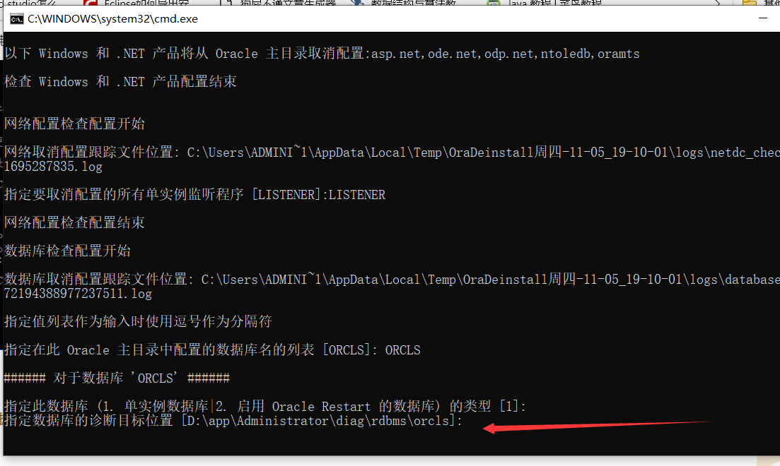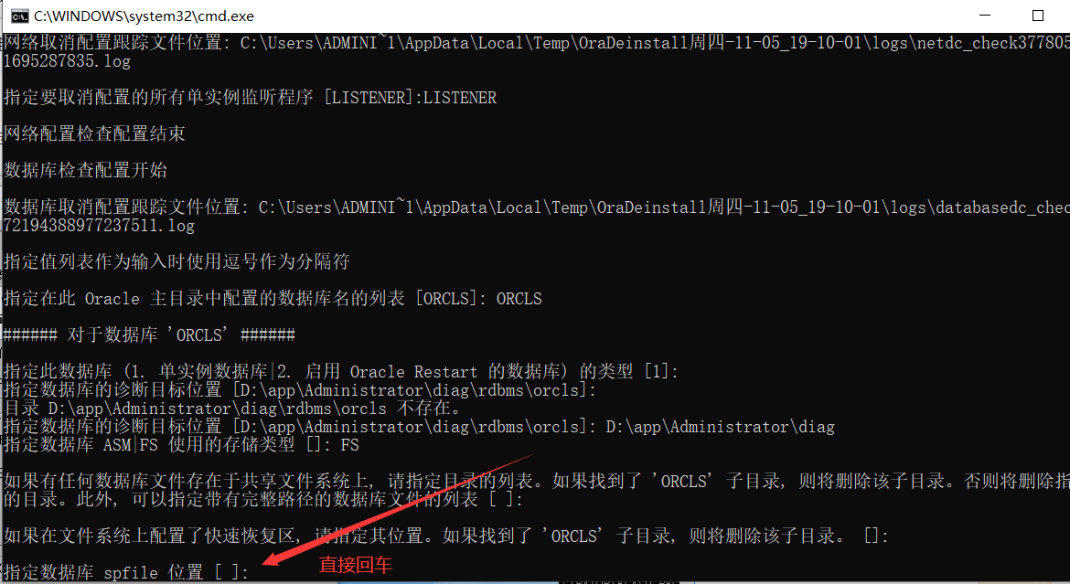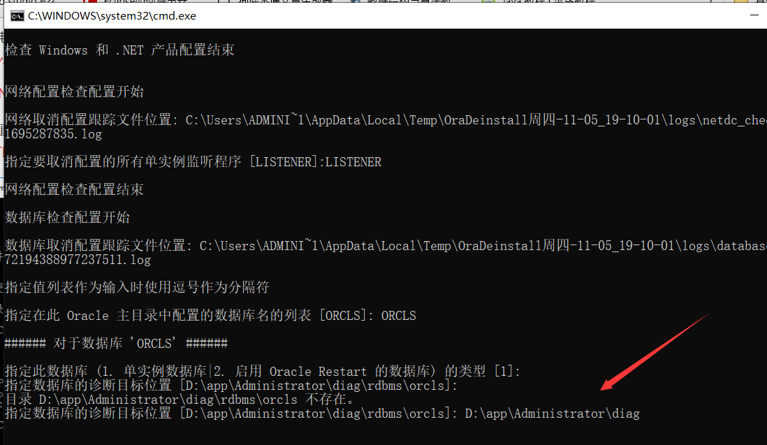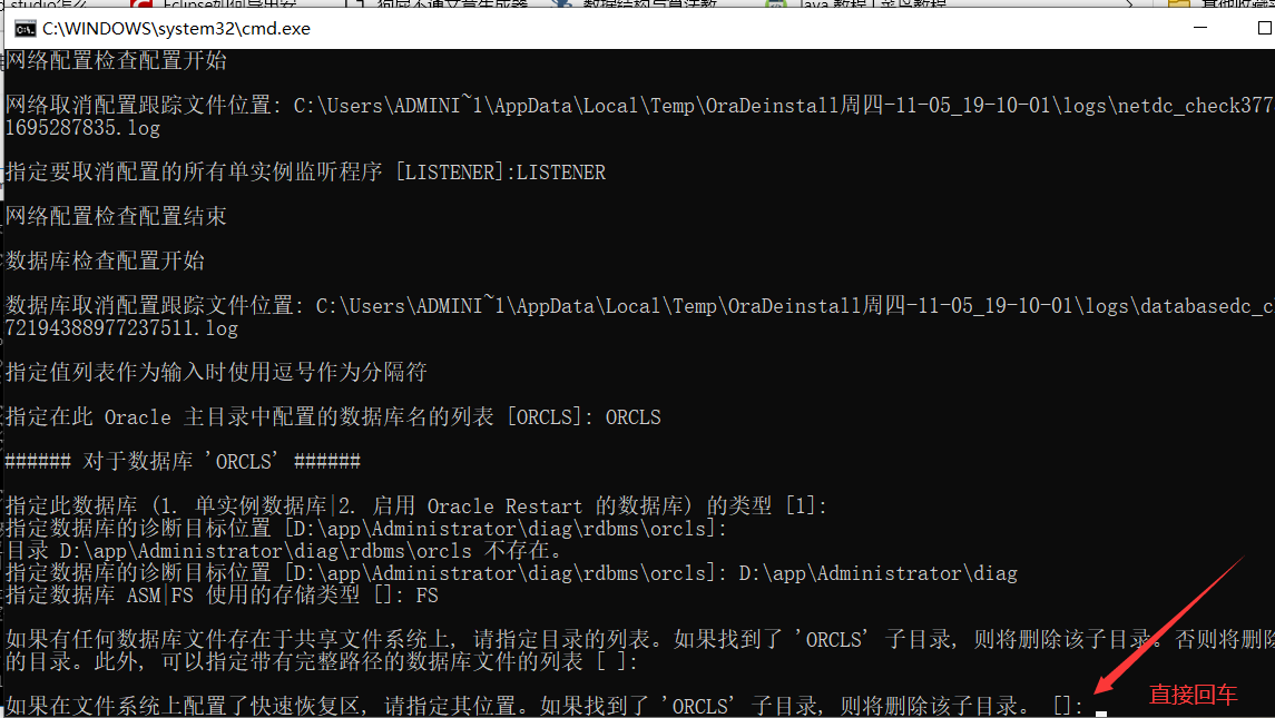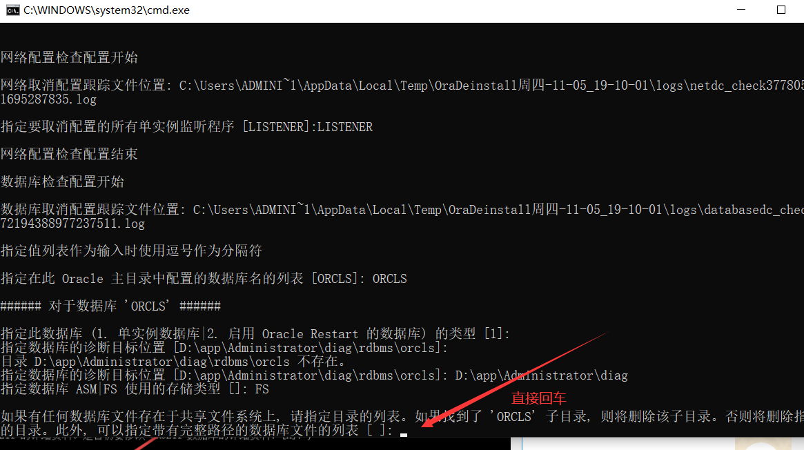 (4)、出现——指定数据库的诊断目标位置 [D:\APP\ADMINISTRATOR\diag\rdbms\orcls]: 直接回车