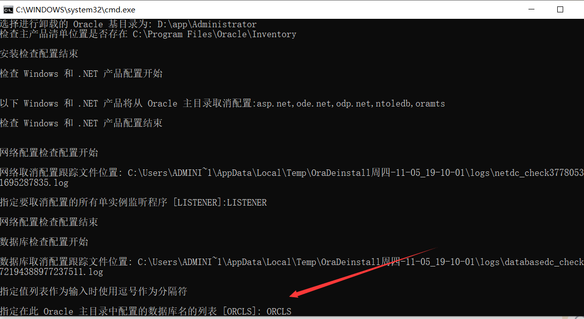 此时输入[]之内的内容,指定多个列表时用英文逗号作为分隔符,本例中只有一个ORCLS故只输入ORCLS然后回车