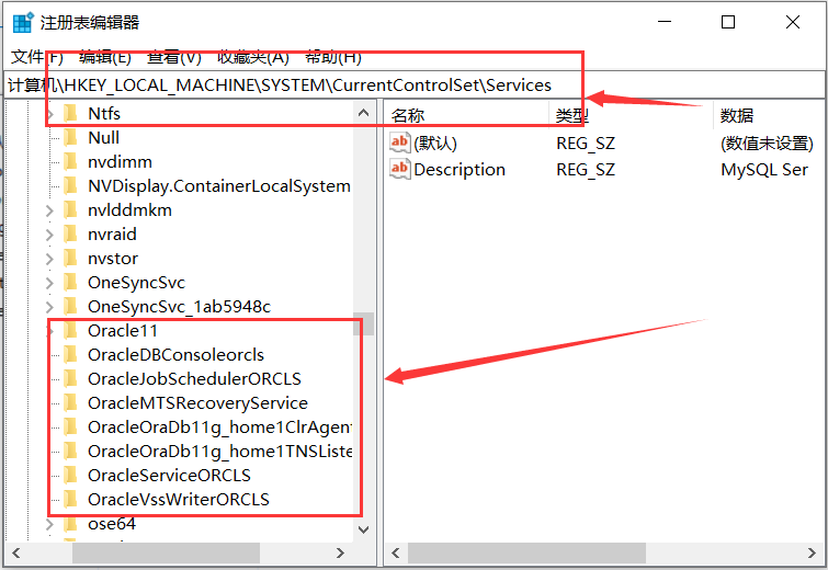 删除HKEY_LOCAL_MACHINE\SYSTEM\CurrentControlSet\Services\路径下的所有Oracle开始的服务名称.