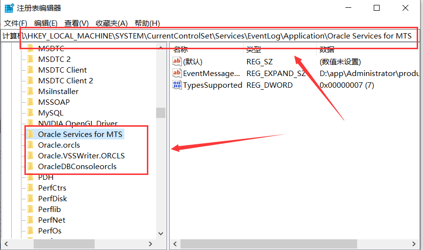 (3)删除HKEY_LOCAL_MACHINE\SYSTEM\CurrentControlSet\Services\Eventlog\Application注册表的所有Oracle开头的所有