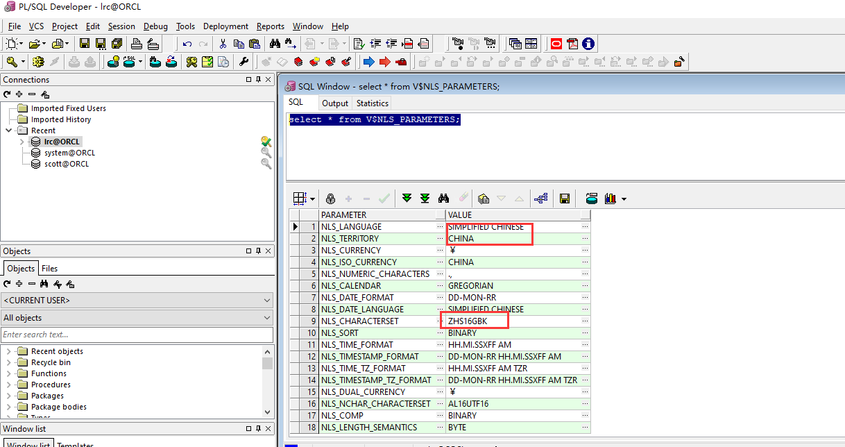 在windows中创 建一个名为“NLS_LANG”的系统环境变量,设置其值为“SIMPLIFIED CHINESE_CHINA.ZHS16GBK”,跟oracle服务器端字符编码一致,然后重新启动 pl/sql developer