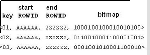 在oracle中是根据rowid来定位记录的,因此,我们需要引入start rowid和end rowid,通过start rowid ,end rowid 和二进制位的偏移,我们就可以非常快速的计算出二进制位所代表的表记录rowid。位图索引的最终逻辑结构如下图:
