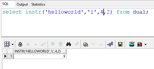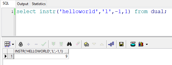 select instr(‘helloworld’,’l’,-1,1) from dual; –返回结果:9 也就是说:在”helloworld”的倒数第1(d)号位置开始,往回查找第一次出现的“l”的位置